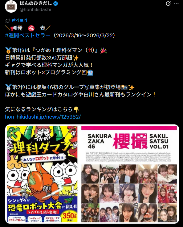 도서 주간 베스트셀러 – TOP5(本の週間ベストセラーTOP20(일본출판판매주식회사 조사 누계기간 : 2026년 3월 16일~22일)